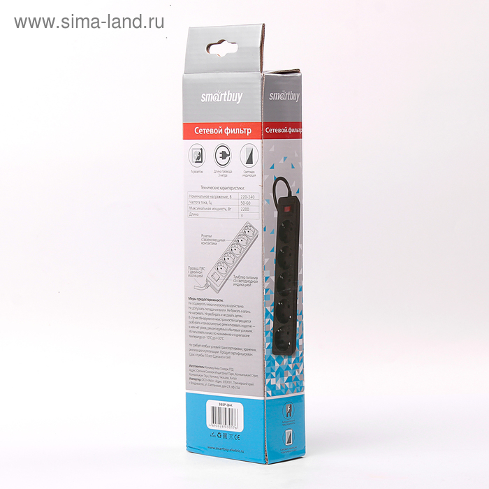 Сетевой фильтр Smartbuy One, 5 розеток, 3 м, 10 А, 2200 Вт, с з/к, черный