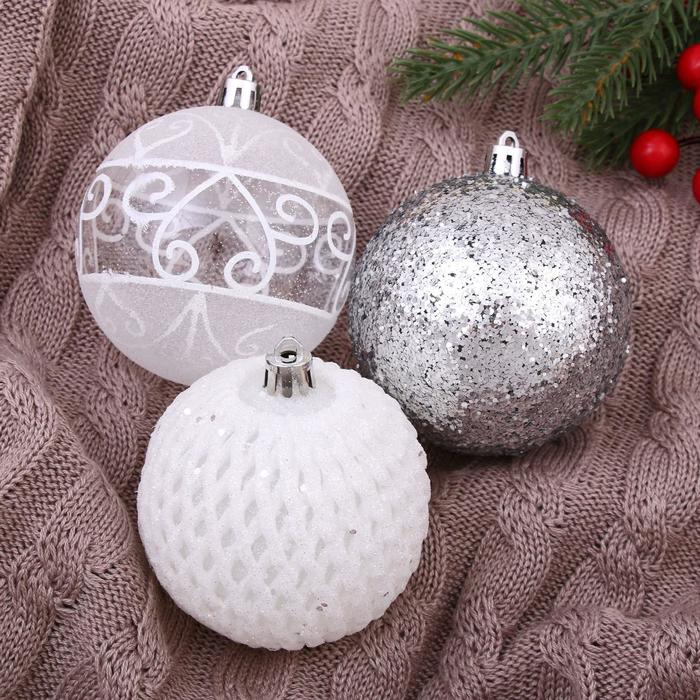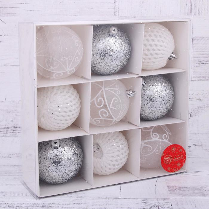 Набор шаров пластик d-8 см, 9 шт "Изморозь" сетка, белый серебро