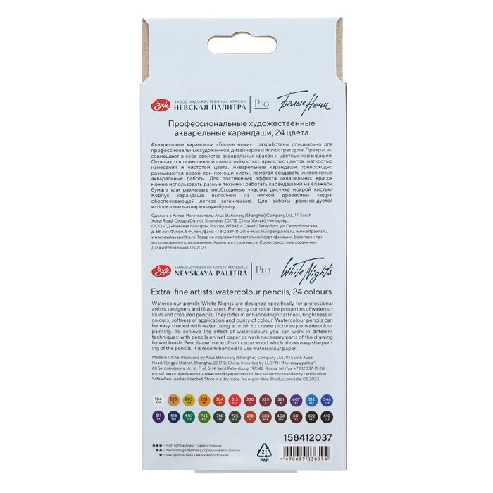 Профессиональные акварельные карандаши "Белые ночи" разработаны специально для профессиональных художников, дизайнеров и иллюстраторов. Прекрасно совмещают в себе свойства акварельных красок и цветных карандашей. Отличаются повышенной светостойкостью, яркостью цветов, мягкостью нанесения и чистотой цвета. Акварельные карандаши превосходно размываются водой при помощи кисти, помогая создавать живописные акварельные работы. Для достижения эффекта акварельных красок можно использовать разные техники: работать карандашами на влажной бумаге или размывать необходимые участки рисунка мокрой кистью. Корпус карандаша выполнен из мягкой древесины кедра, обеспечивающей легкое затачивание. Для работы рекомендуется использовать акварельную бумагу.