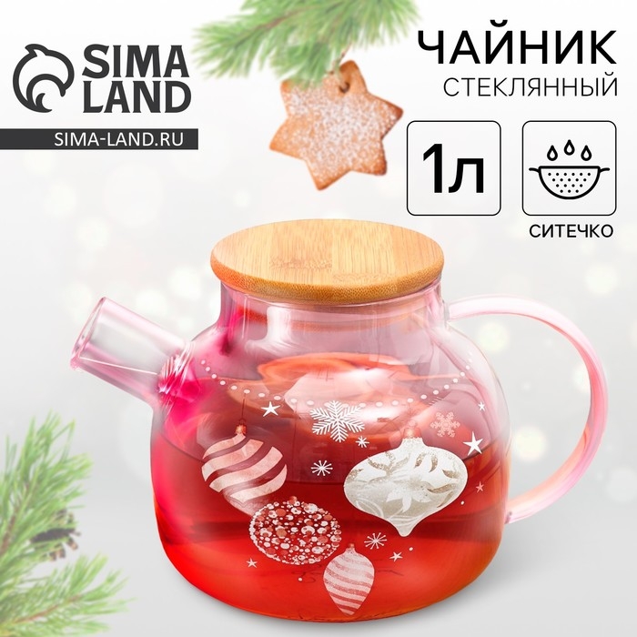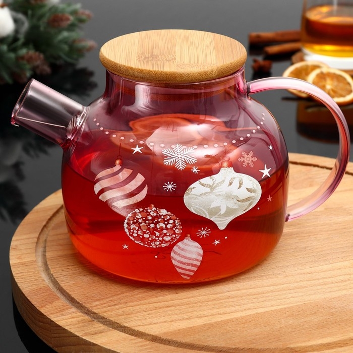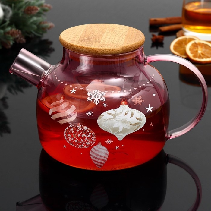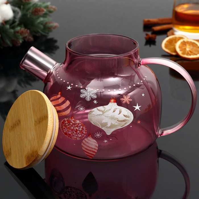 Новый год. Чайник заварочный стеклянный с бамбуковой крышкой «Розовая сказка», 1000 мл