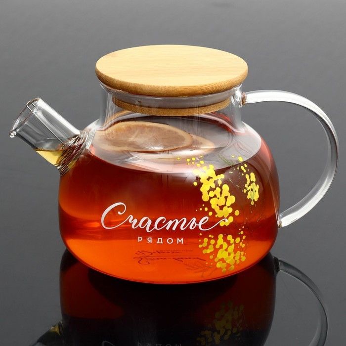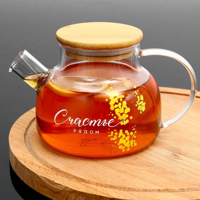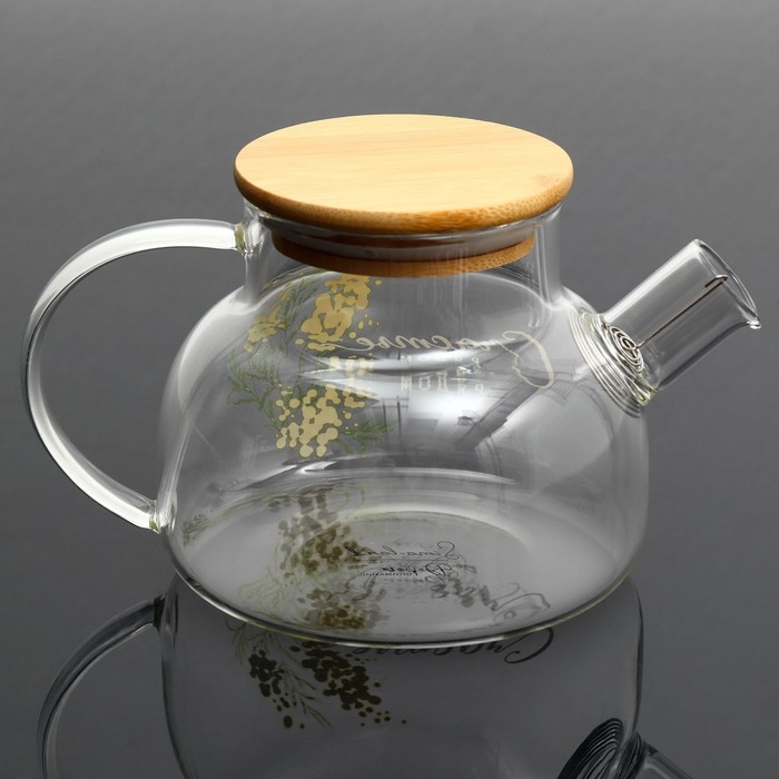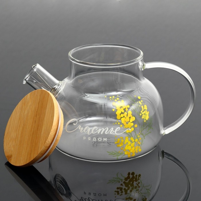 Чайник стеклянный заварочный с бамбуковой крышкой «Счастье рядом. Нежная мимоза», 800 мл