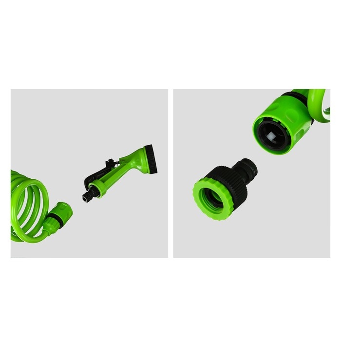 Шланг поливочный спиральный, 7,5 м, быстросъёмный, с насадкой для полива и штуцером, зелёный, Greengo
