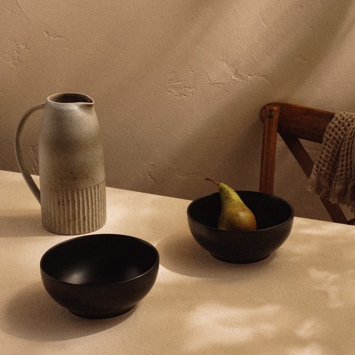 Изящный чёрный цвет и гладкая текстура без рисунков делают эти миски универсальным дополнением к любому интерьеру, подчеркивая его стиль и утонченность. Набор включает две миски, что делает его практичным выбором как для ежедневного использования, так и для особых случаев.