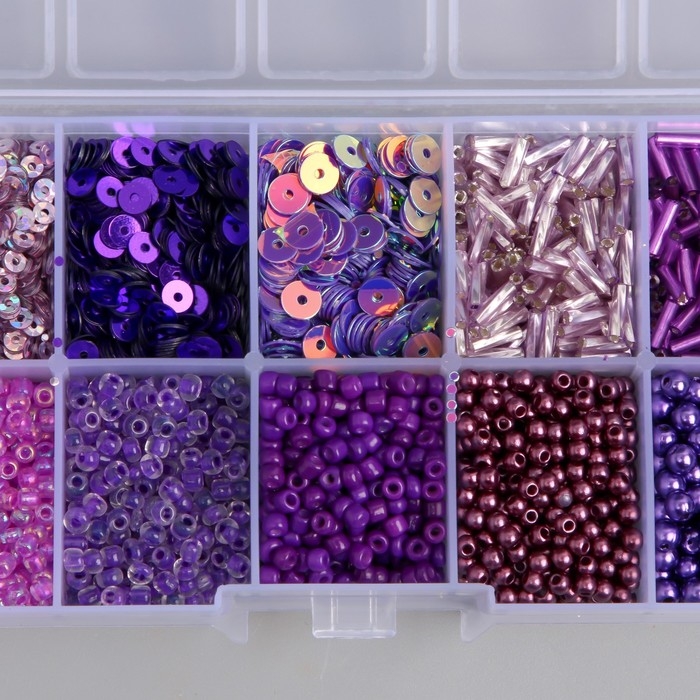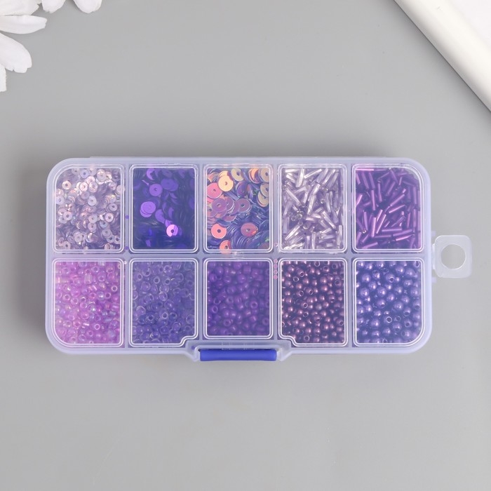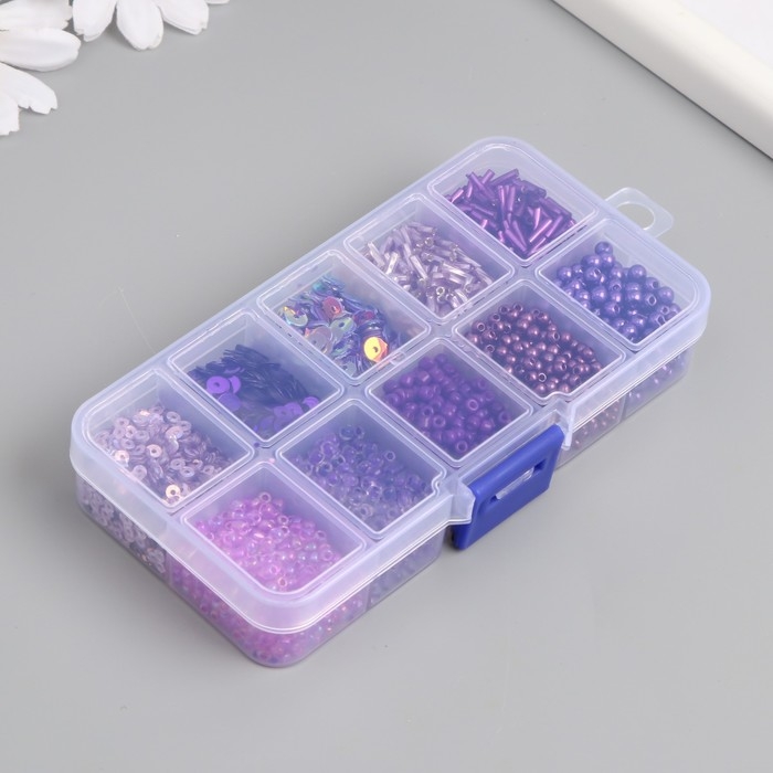 Бисер стекло 8/0, 12/0 в шкатулке "Фиолетовый" бусины, стеклярус и пайетки 13х6,5х2,3 см