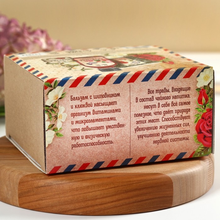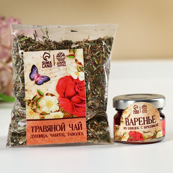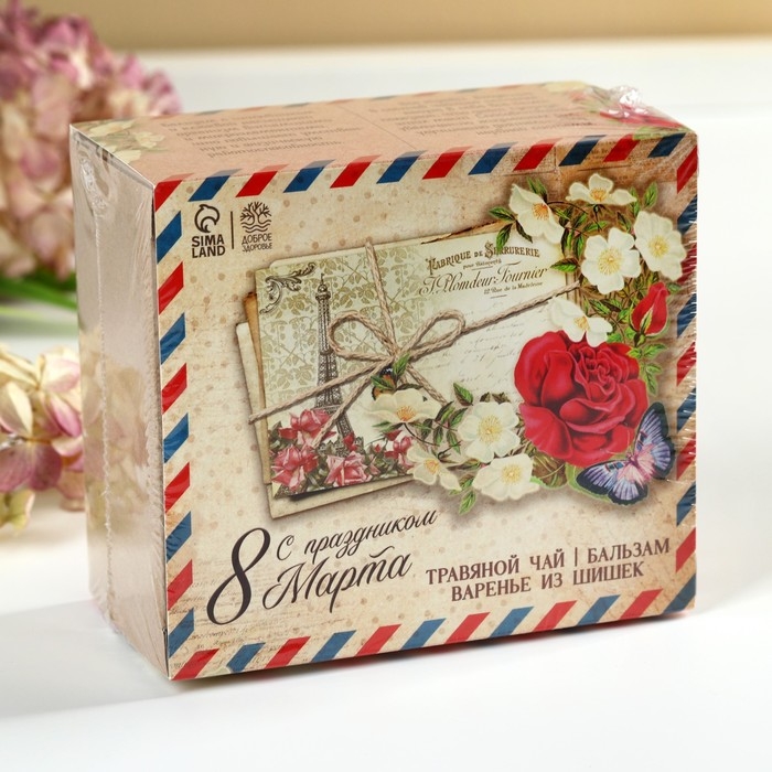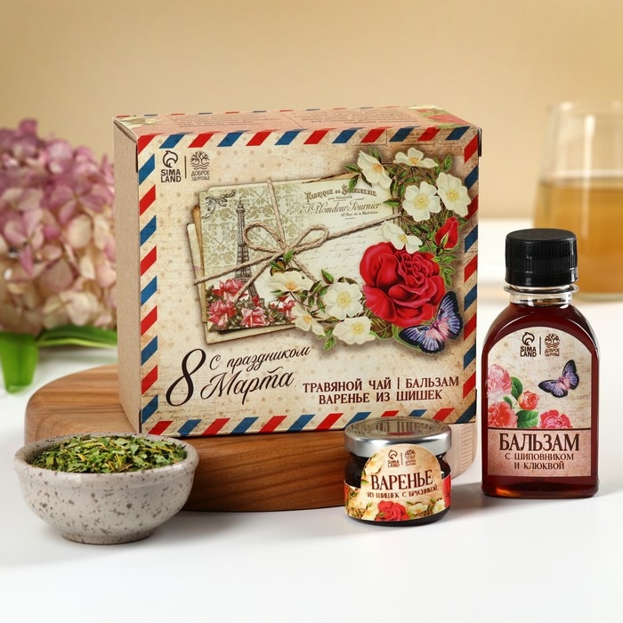 Подарочный набор «С праздником 8 марта»: чай травяной 20 г., варенье из сосновых шишек с брусникой 30 г., сироп 100 мл.
