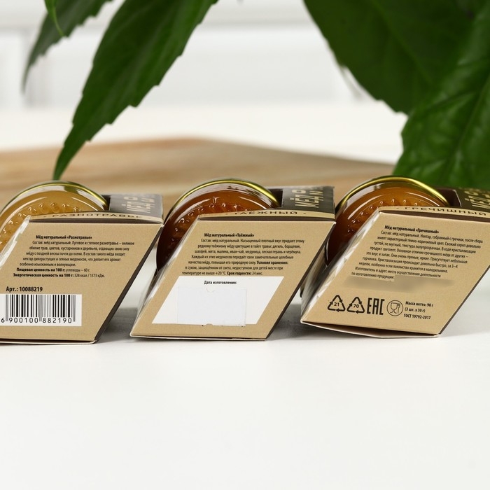 Набор «Тому, кто ценит вкус жизни»: мёд гречишный, мёд разнотравье, мёд таёжный, 3 шт. х 30 г.