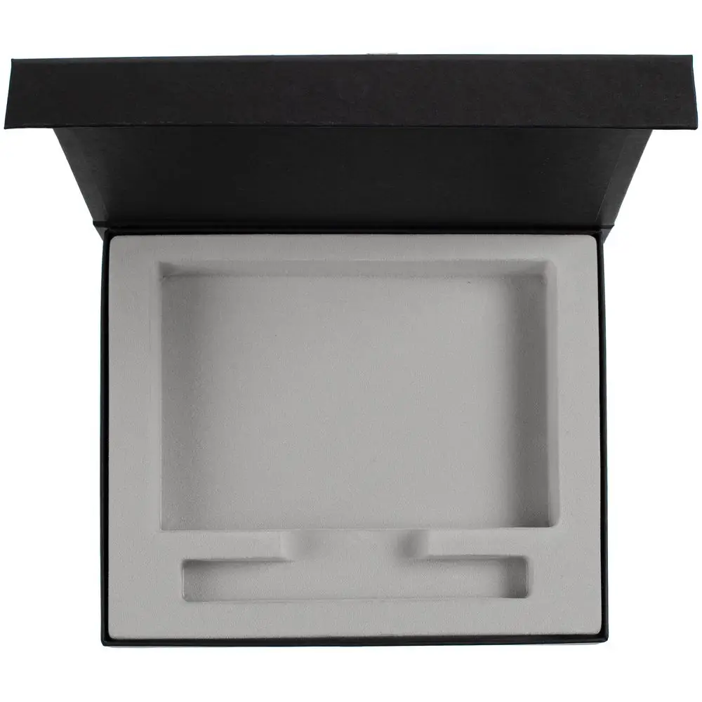 Коробка из переплетного картона, кашированного гладкой дизайнерской бумагой Magic, с крышкой на магните и флокированным ложементом.