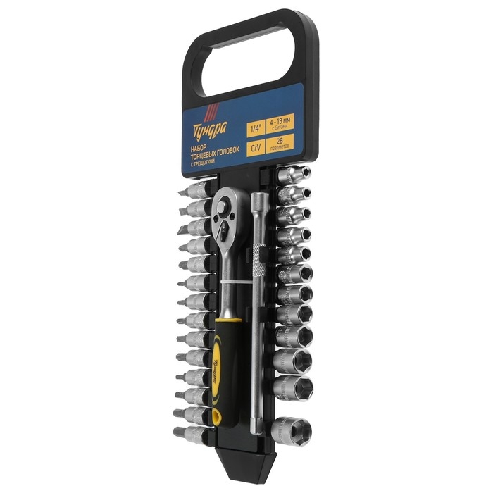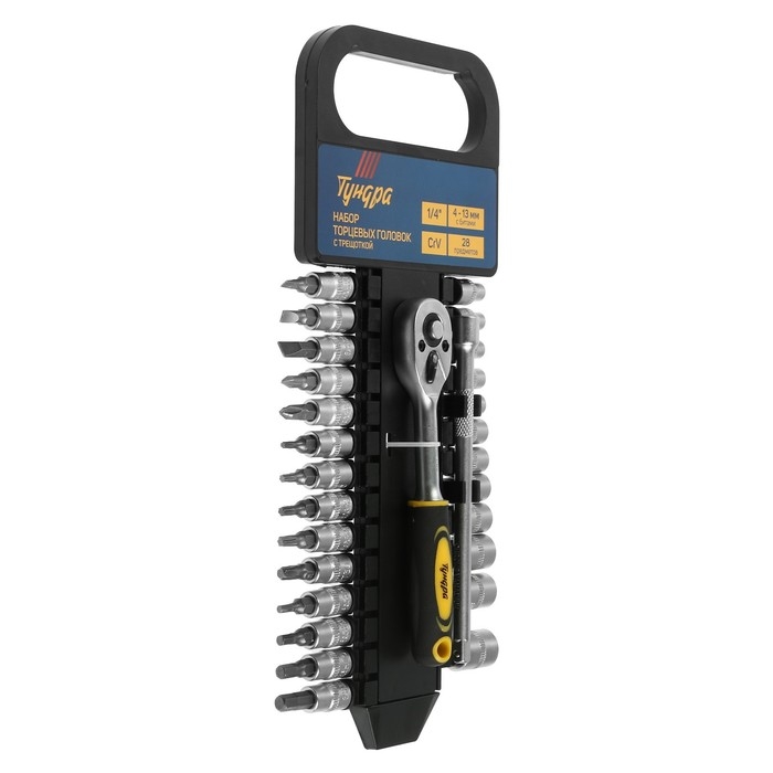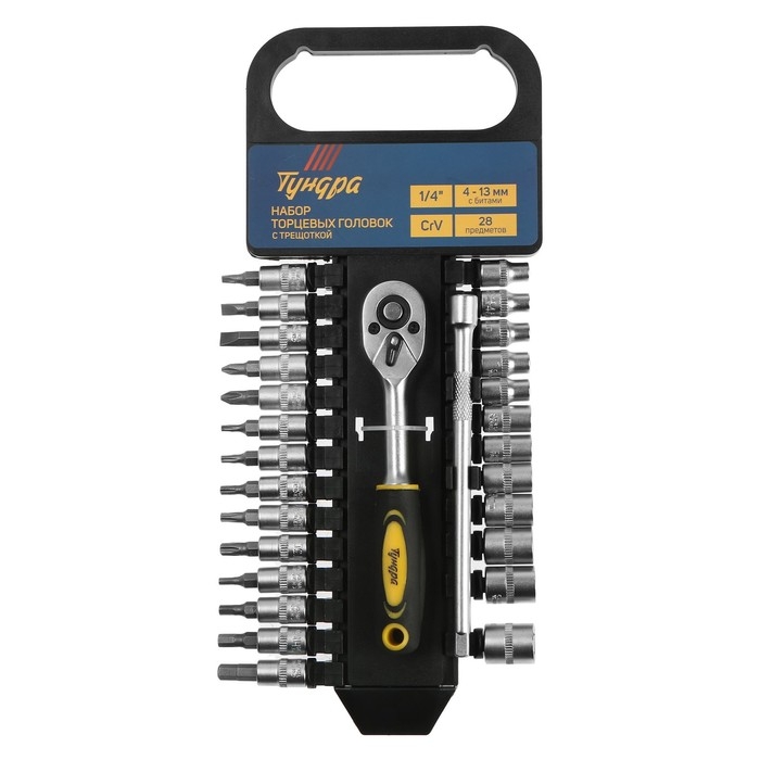 Набор торцевых головок ТУНДРА, трещотка, CrV, 1/4", 4 - 13 мм с битами, 28 предметов