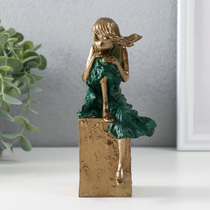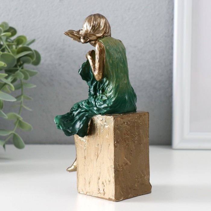 Сувенир полистоун "Девочка в платье цвета морской волны сидит на кубе" бронза 7,5х7х16 см