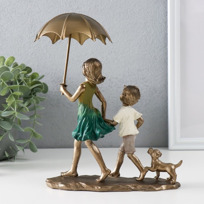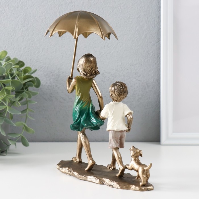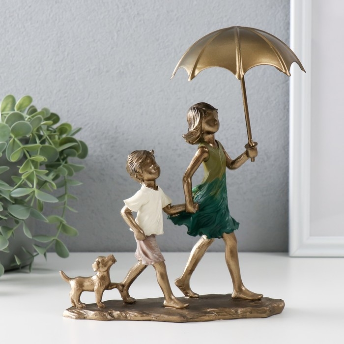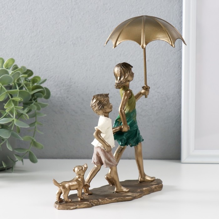 Сувенир полистоун "Дети гуляют под зонтом, с щенком" бронза 18х9,5х21,5 см