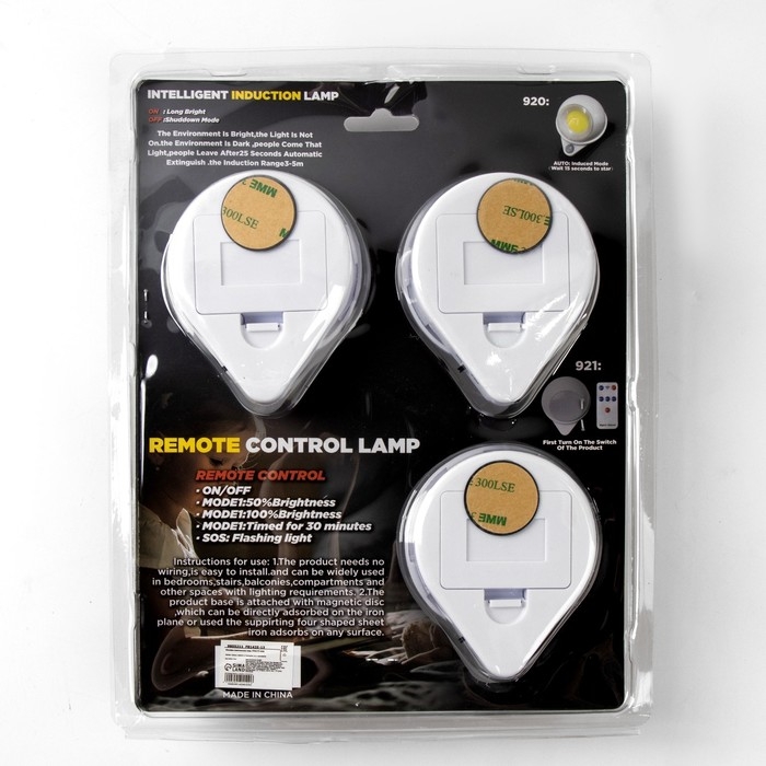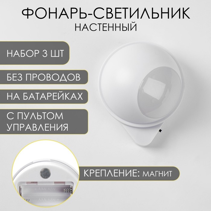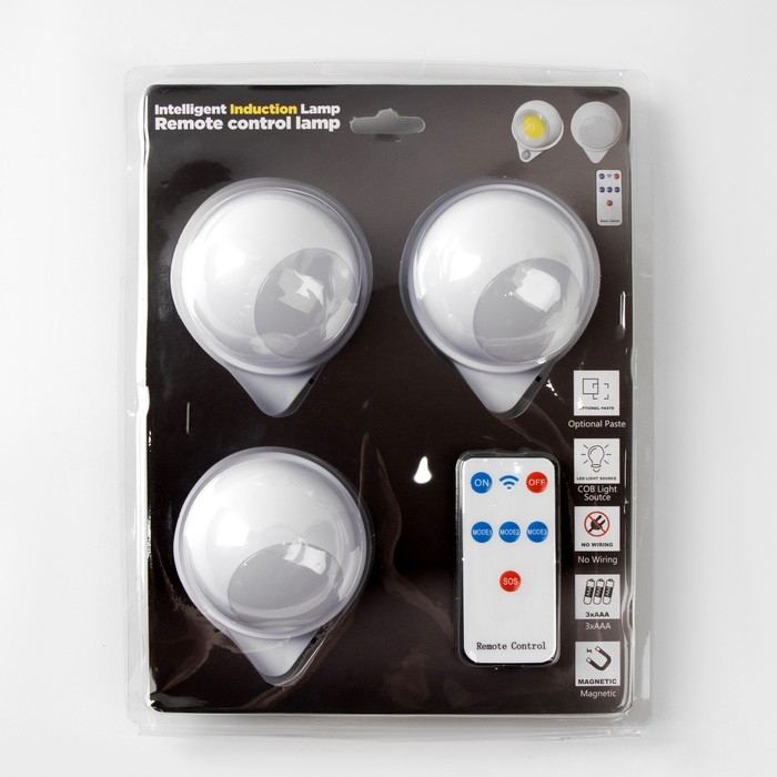 Фонарь-светильник, 3 шт, 50 лм, COB, 3 ААА, магнит, клейкая основа, с пультом, 7.5 х 9.2 см