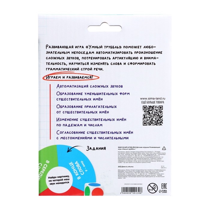Развивающий набор «Умный труббль» поможет малышам от 3 лет автоматизировать произношение сложных звуков, потренировать артикуляцию и внимательность, научиться изменять слова и сформировать грамматический строй речи.