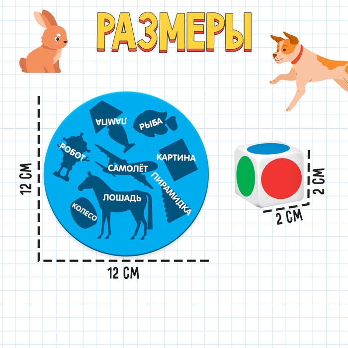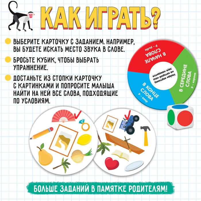 Внутри вы найдёте 70 карточек с разными животными и предметами, кубик и памятку для родителей.