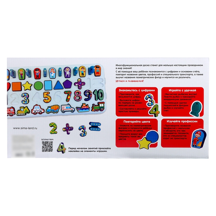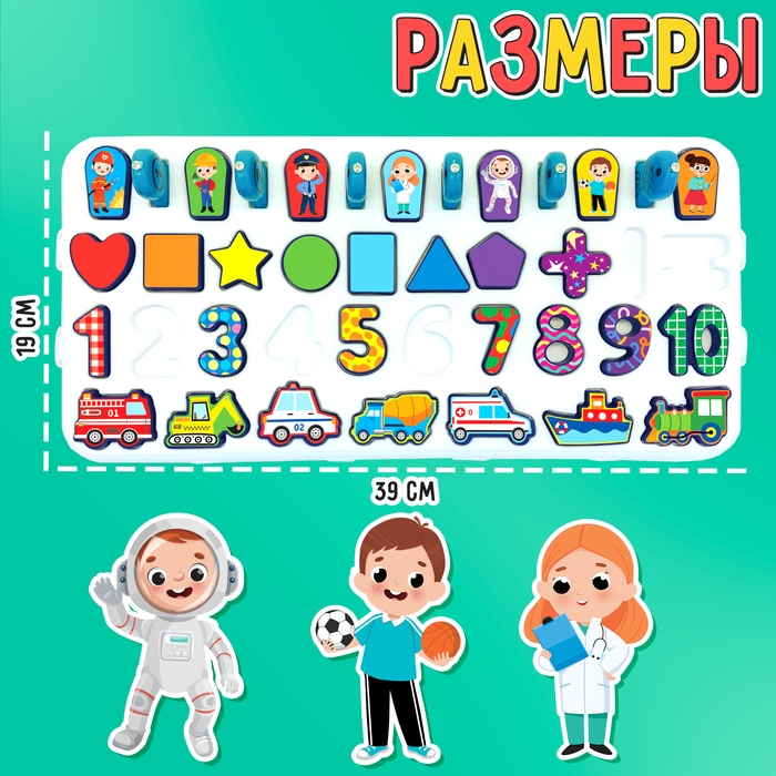 Развивающий бизиборд «Профессии и транспорт» — это многофункциональная доска, с помощью которой ребёнок познакомится с цифрами и основами счёта, повторит названия цветов, профессий и специального транспорта, а также выучит названия геометрических фигур и научится их различать.