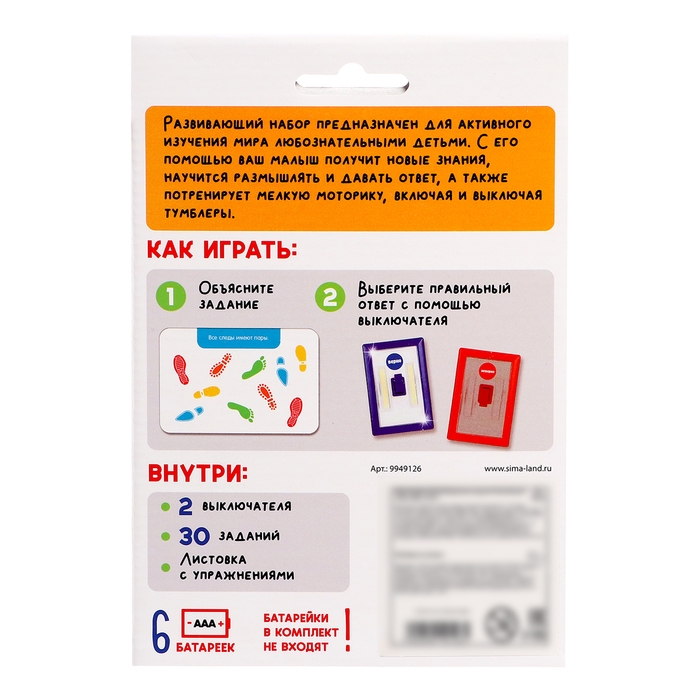 Внутри вы найдёте 2 выключателя синего и красного цвета, 30 заданий и листовку с полезными упражнениями.