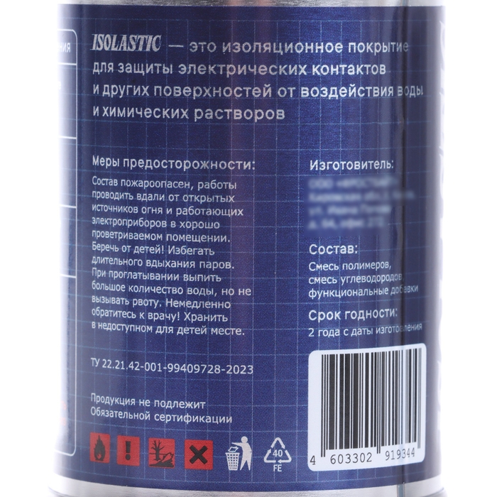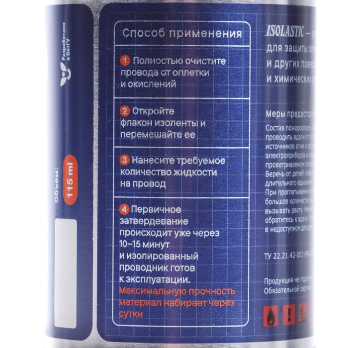 Жидкая изолента ISOLASTIC обеспечивает образование эластичной обволакивающей оболочки на обрабатываемой поверхности. В состав входит смесь синтетических полимеров имеющих уникальную рецептуру и высокие механические показатели.