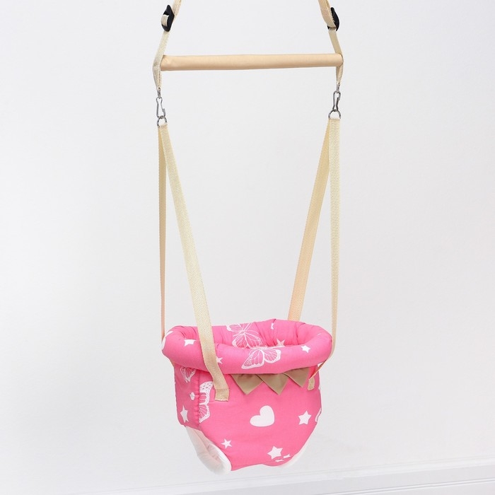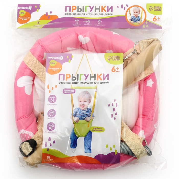 Посадите полугодовалого кроху в сиденье-штанишки. Малышу понравится активная игра, он будет подпрыгивать и качаться. Размер посадочного места можно настроить индивидуально, а за перекладину ребёнку будет удобно держаться.