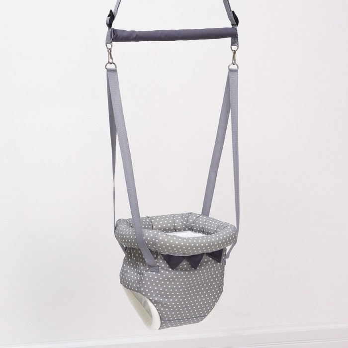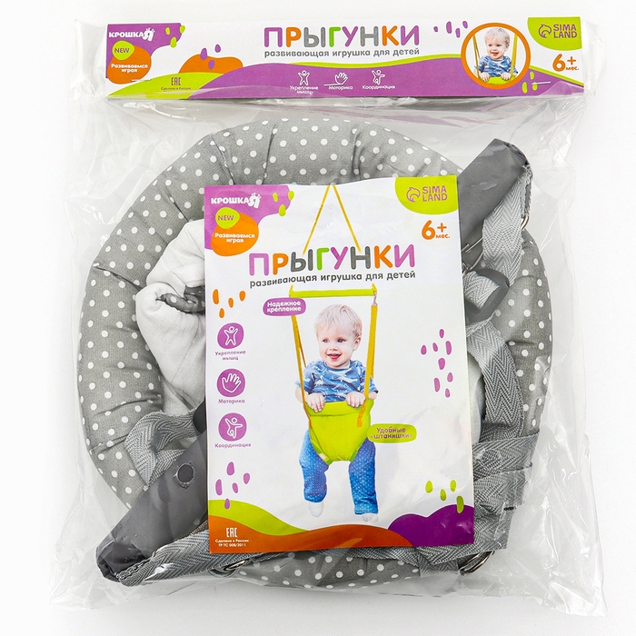 Посадите полугодовалого кроху в сиденье-штанишки. Малышу понравится активная игра, он будет подпрыгивать и качаться. Размер посадочного места можно настроить индивидуально, а за перекладину ребёнку будет удобно держаться.