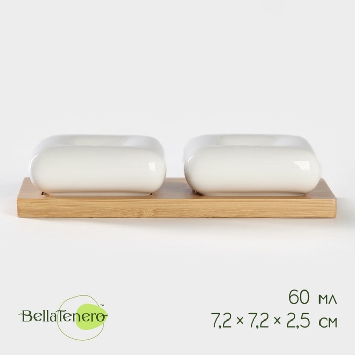 Набор фарфоровый для специй на бамбуковой подставке BellaTenero, 3 предмета: солонка 60 мл, перечница 60 мл, подставка, цвет белый