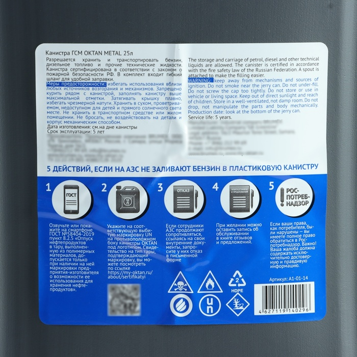 Канистра ГСМ Oktan METAL, 25 л, пластиковая, серая