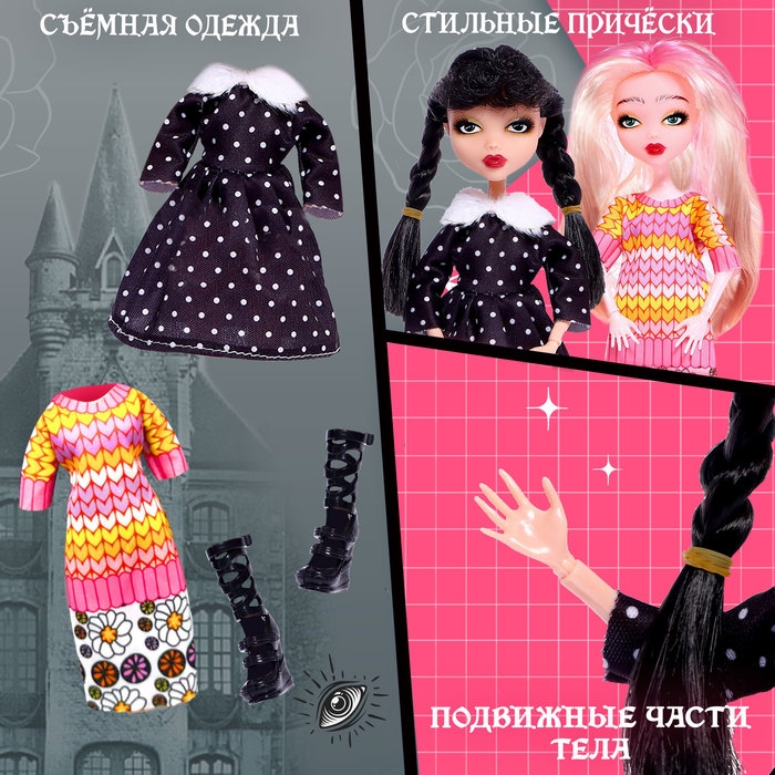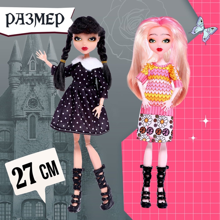 Набор шарнирных кукол «Милые злодейки» включает в себя двух персонажей — Уэнздей и Энид, каждая из которых обладает ярким индивидуальным стилем и особенностями. Благодаря съемной одежде и стильным прическам, дети могут создавать различные образы для своих любимых персонажей и развивать фантазию.