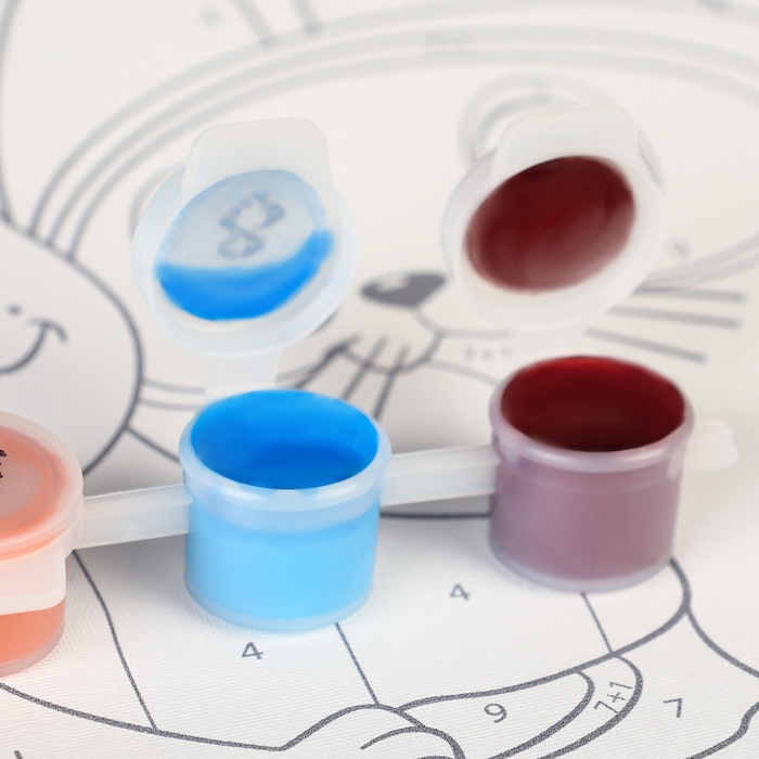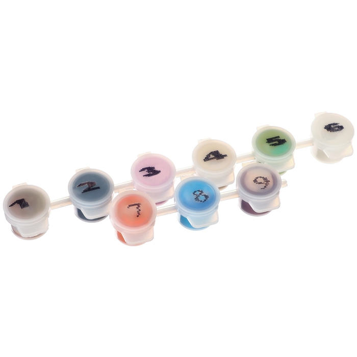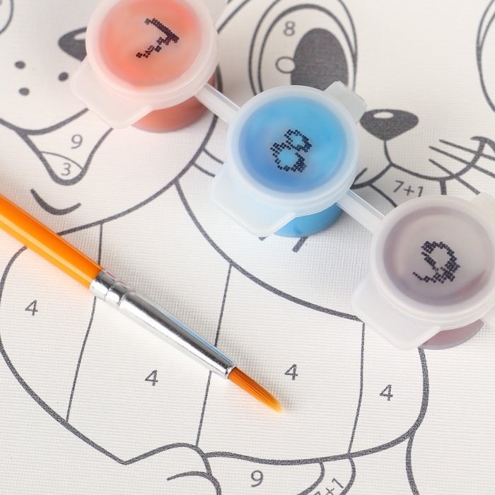 Холст разделён на фрагменты, на каждом из которых указано число, соответствующее цвету, которым нужно закрасить данный участок. В набор входят все необходимые оттенки красок, каждый из которых пронумерован.