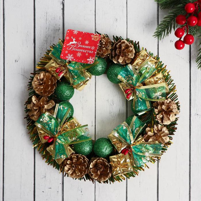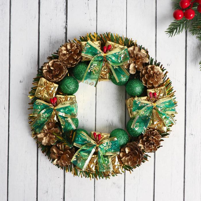 Венок новогодний d-22 см "Зелёные бантики и шарики"