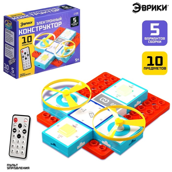 Электронный конструктор «Эврики» поможет ребёнку познакомиться с законами физики и электроники. Он легко собирается по инструкции, все электросхемы работают с помощью пульта управления. Пропеллеры вращаются в разные стороны, а лампы горят разными цветами, в зависимости от того, как их подключить.