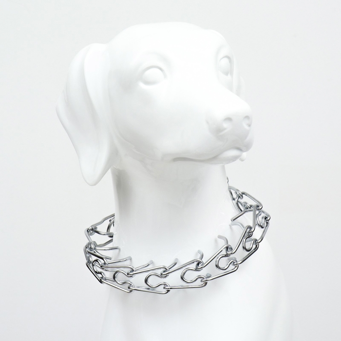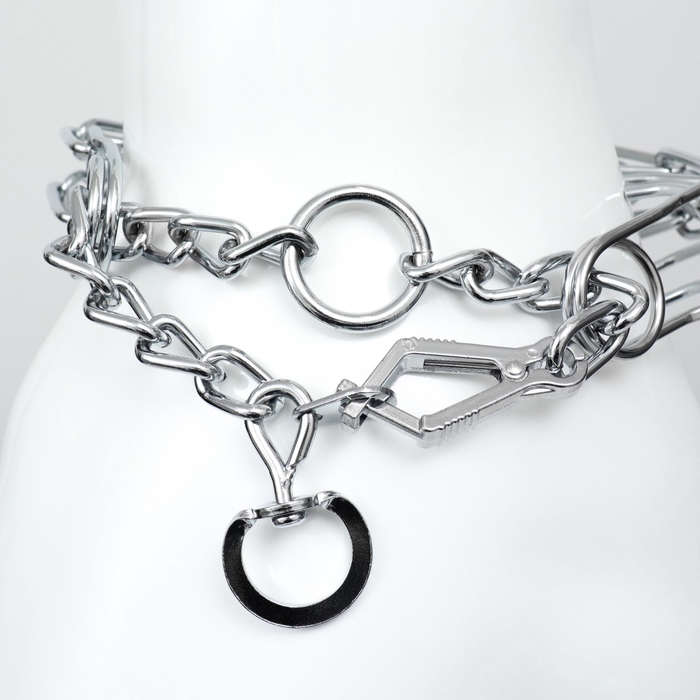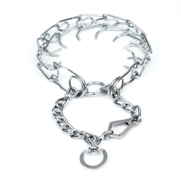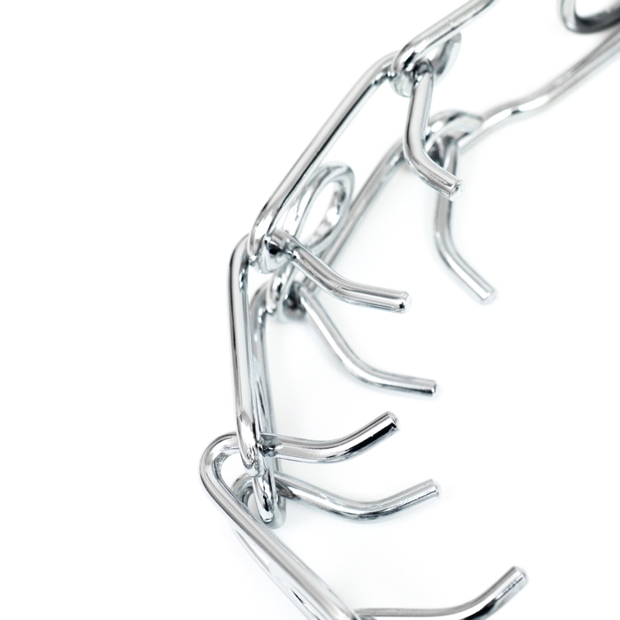 При рывке собаки ошейник сокращается в диаметре, поднимаются специально отогнутые проволочные зубья, приносящие собаке неприятные ощущения.Гладко отполированные зубья предохраняют шею собаки от повреждения.Обязательно пристёгивайте ошейник одновременно за оба кольца.