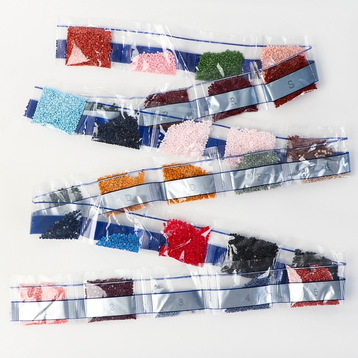 - Из пакетика с номером, который соответствует схеме, отсыпьте в ёмкость немного страз.