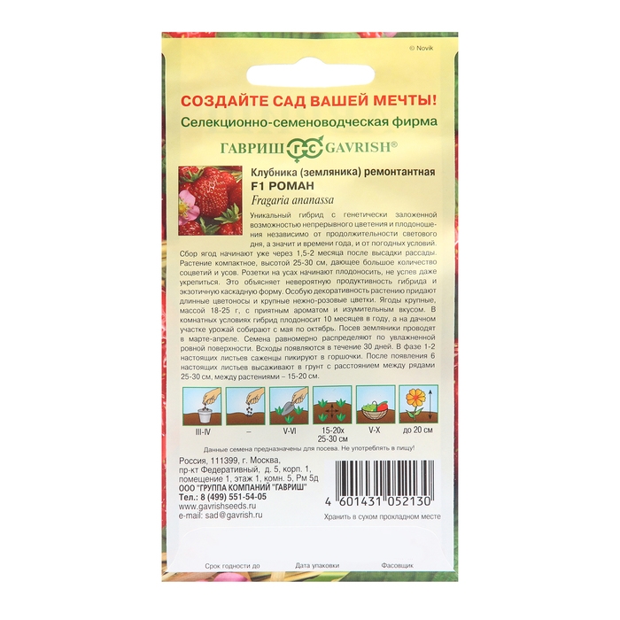 Уникальный гибрид с генетически заложенной возможностью непрерывного цветения и плодоношения независимо от продолжительности светового дня, а значит и времени года, и от погодных условий. Сбор ягод начинается уже через 1,5-2 месяца после высадки рассады. Растение представляет собой компактный куст, высотой 25-30 см, дающий большое количество соцветий и усов. Розетки на усах начинают плодоносить, не успев даже укрепиться. Это объясняет невероятную продуктивность гибрида и экзотичную каскадную форму. Особую декоративность растению придают длинные цветоносы и крупные нежно-розовые цветки. Ягоды крупные, массой 18-25 г, с приятным ароматом и изумительным вкусом. В комнатных условиях гибрид плодоносит 10 месяцев в году, а на дачном участке урожай собирают с мая по октябрь. Посев земляники производят в марте-апреле. Семена равномерно распределяют по увлажненной ровной поверхности. Всходы появляются в течение 30 дней. В фазе 1-2 настоящих листьев саженцы пикируют в горшочки. После появления 6 настоящих листьев высаживают в грунт с расстоянием между рядами 25-30 см, между растениями 15-20 см. Сбор урожая начинают со второй половины июня.
