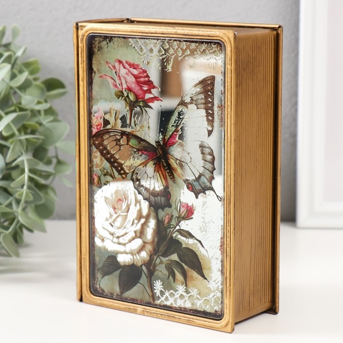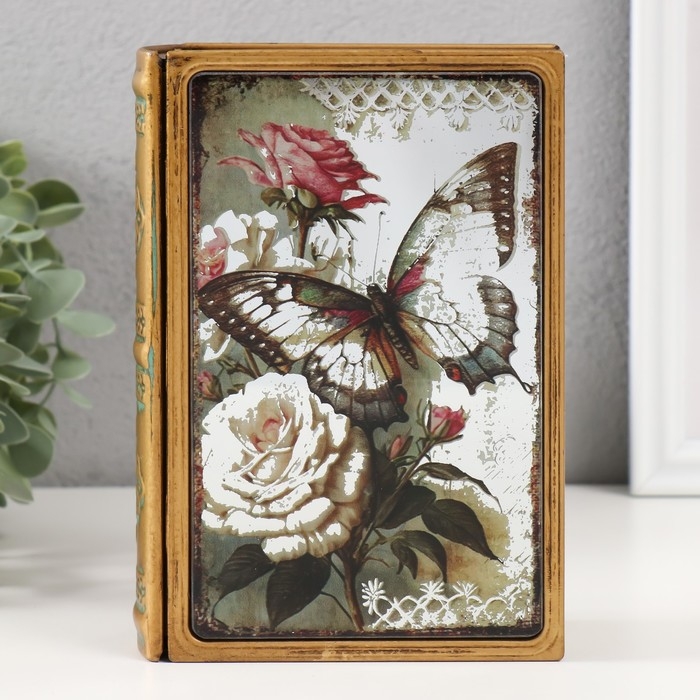Шкатулка-книга металл, кожзам "Бабочка и розы" с зеркалом 17х12х5 см