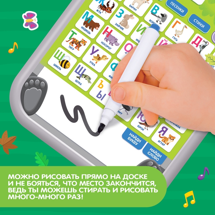 Обучающий планшет — это увлекательная развивающая игрушка, которая познакомит малыша с русским алфавитом, забавными животными, а также развлечёт играми, стихами и песнями.