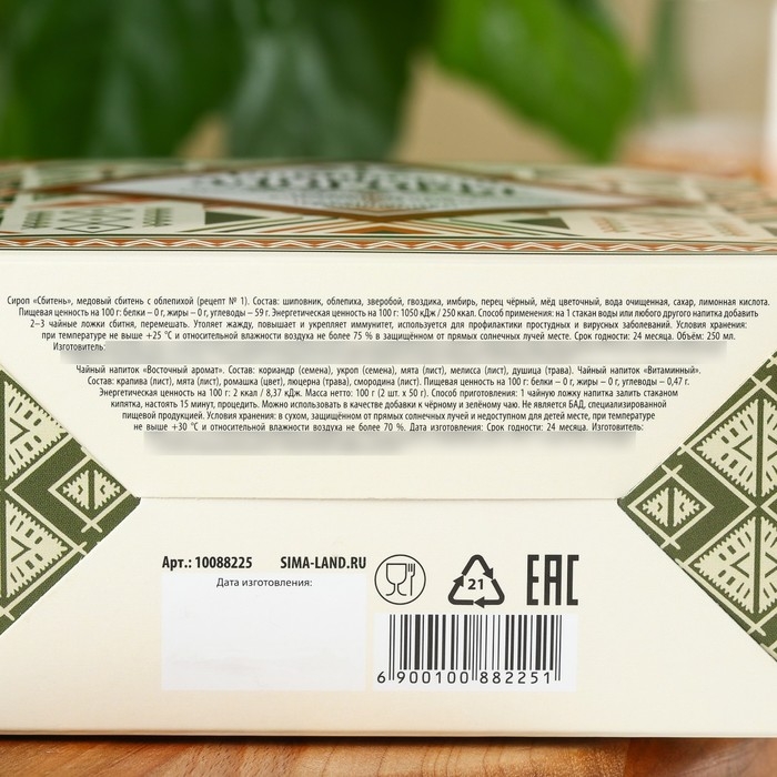 Состав: шиповник, корица, гвоздика, имбирь, лимон, облепиха, мёд цветочный, вода очищенная, сахар, лимонная кислота.