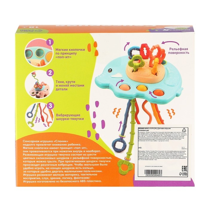 Сенсорная игрушка «Слоник» надолго привлечет внимание ребенка. Мягкие кнопочки имеют принцип «поп-ит», ани проваливаются при нажатии внутрь и наоборот. Развивающая игрушка-тянучка состоит из шести цветных силиконовых шнурков с рельефной поверхностью, которые можно грызты. При протягивании шнурки-тянучки производят различные вибрации. Чтобы малышам было удобно играть, на концах шнурков есть кольца, за которые удобно дергать маленькими пальчиками. Игрушка развивает мелкую моторику, тактильное восприятие, слух, зрение, логику, фантазию: Игрушка инготовлена из безопасного ABS-плостика.