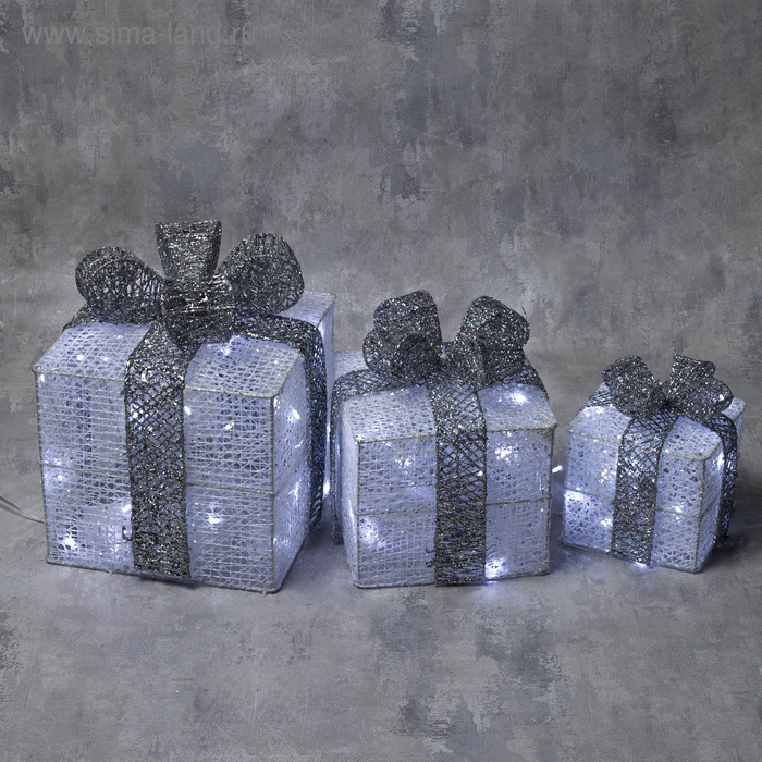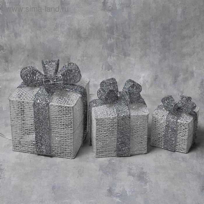Светодиодная фигура «Подарки с серой лентой» 15, 20, 25 см, текстиль, металл, 220 В, 8 режимов, свечение белое
