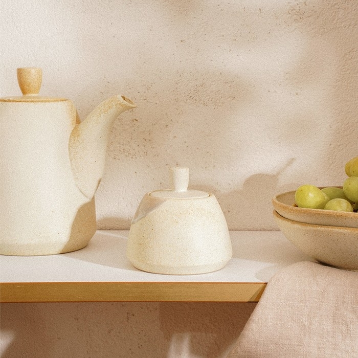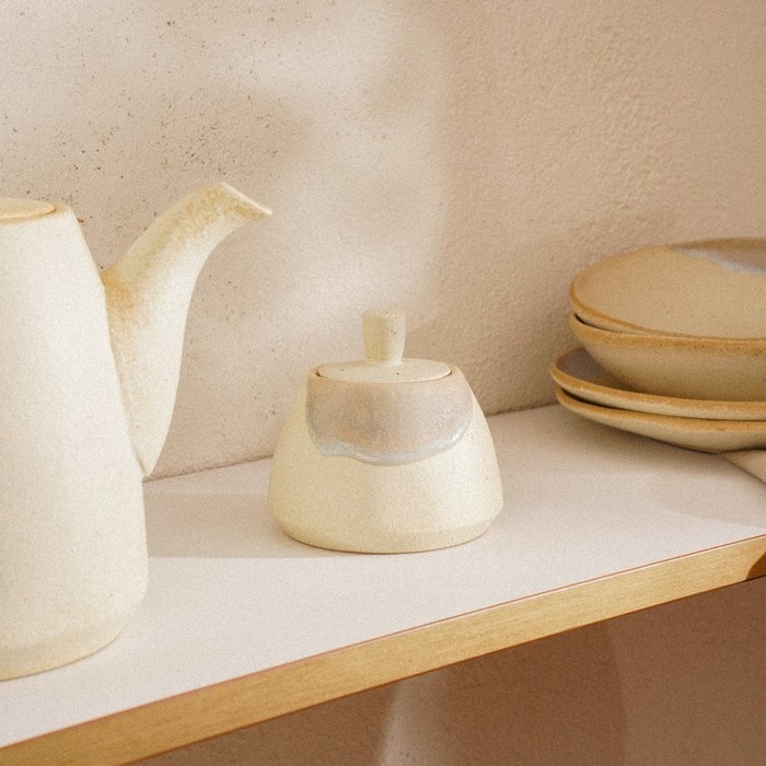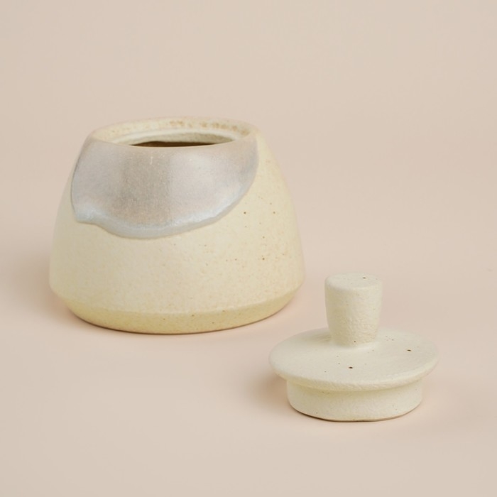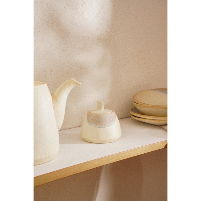 Благодаря своей круглой и цилиндрической форме, сахарница удобно помещается в руке и занимает минимальное пространство на столе. Уникальный бежевый цвет с волнообразным рисунком привнесет спокойствие и гармонию в любую сервировку.