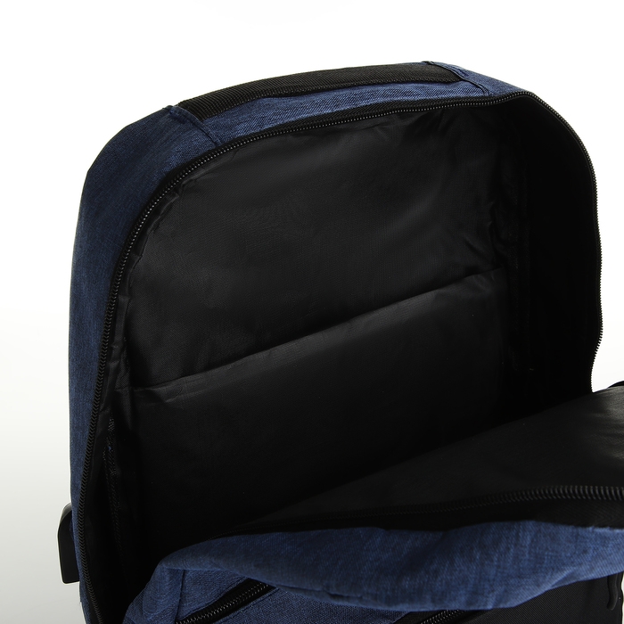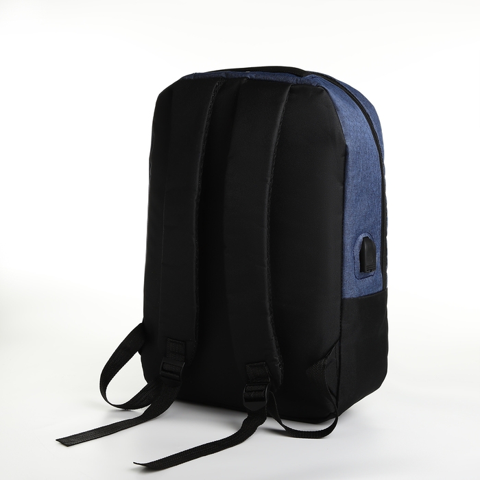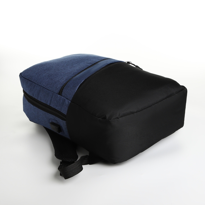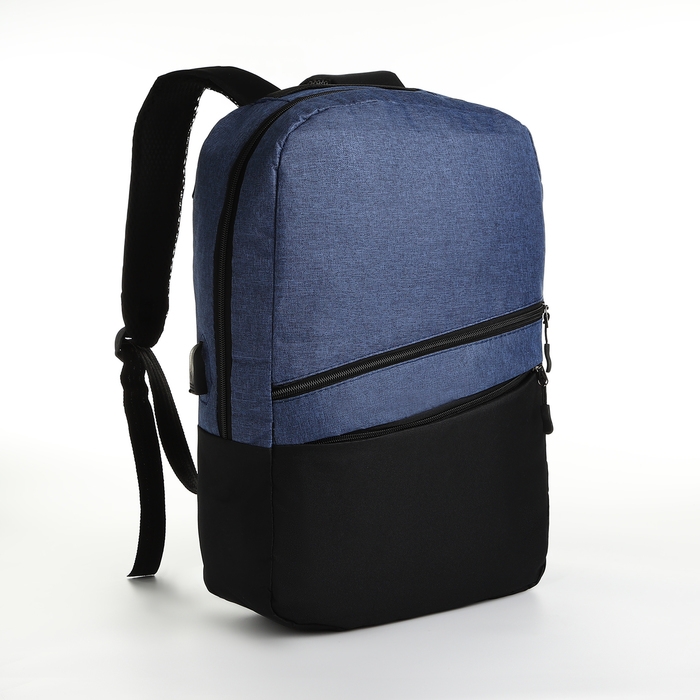 Рюкзак городской с USB из текстиля на молнии, 2 кармана, цвет чёрный/синий