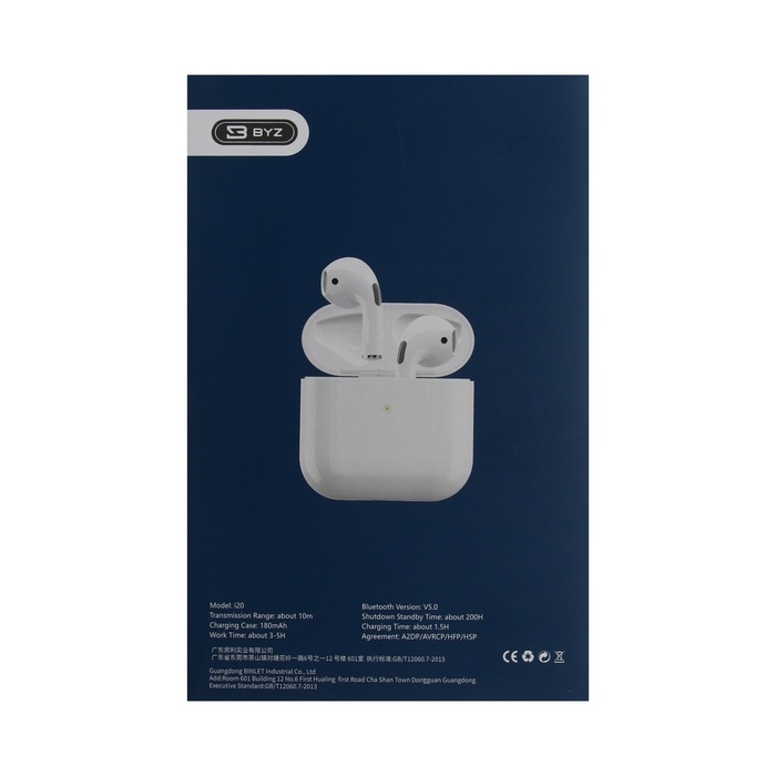 Наушники BYZ i20, беспроводные, вкладыши, микрофон, шумоподавление, ВТ 5.0, 180 мАч, белые