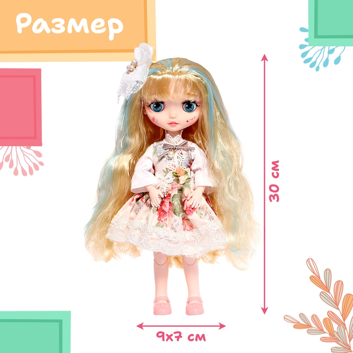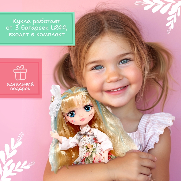 Интерактивная кукла «Любимая подружка» станет хорошим подарком для малышки. Кукла одета в милое платье с минималистичным принтом и нежно-розовые туфельки. У неё длинные светлые волосы с голубыми прядями, а на её голове большая белая заколка.