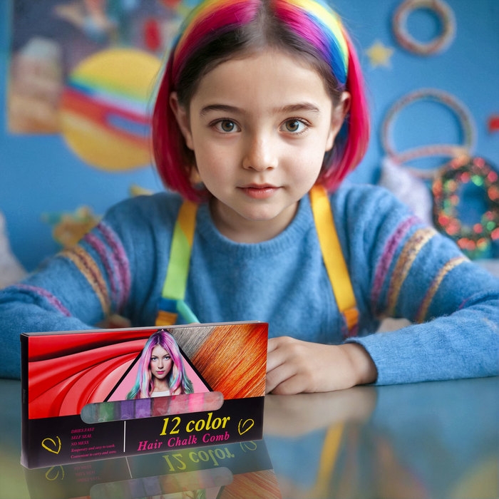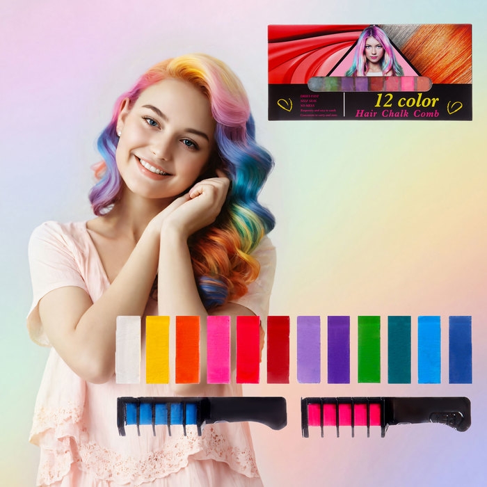 Мелки для волос с расческой - позволяет создавать яркие и необычные образы. Они содержат натуральные пигменты, которые не повреждают волосы и легко смываются водой . Они безопасны для здоровья волос и не содержат вредных веществ.