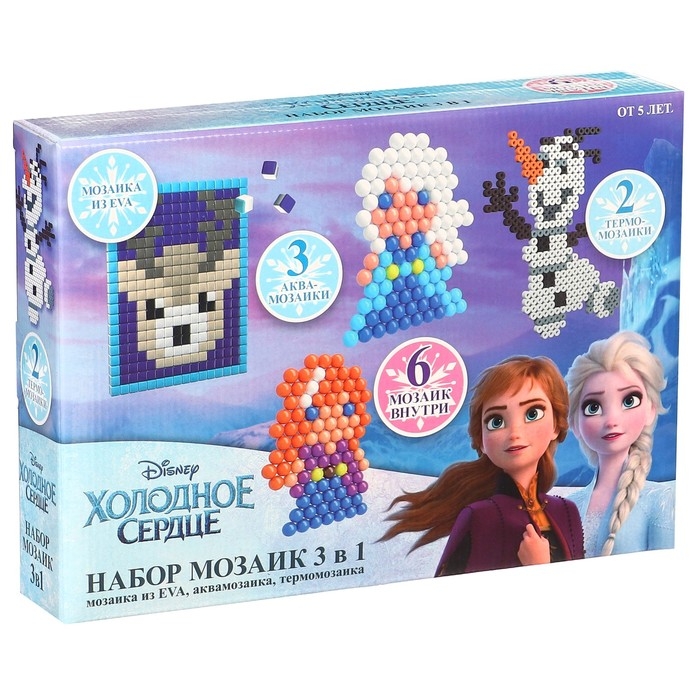 Набор мозаик 3 в 1 «Холодное сердце» — это увлекательный и развивающий комплект для детей от 4 лет, включающий аквамозаику, темпомозаику и мозаику из EVA.