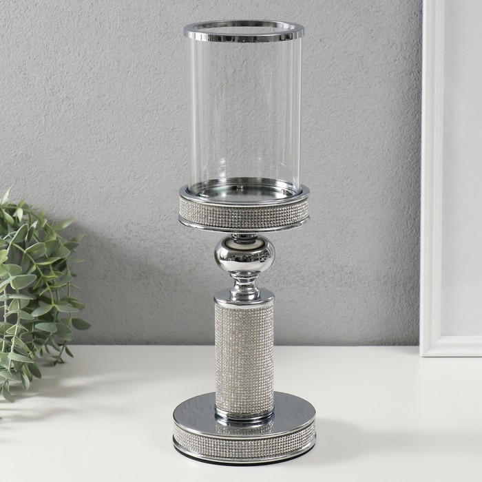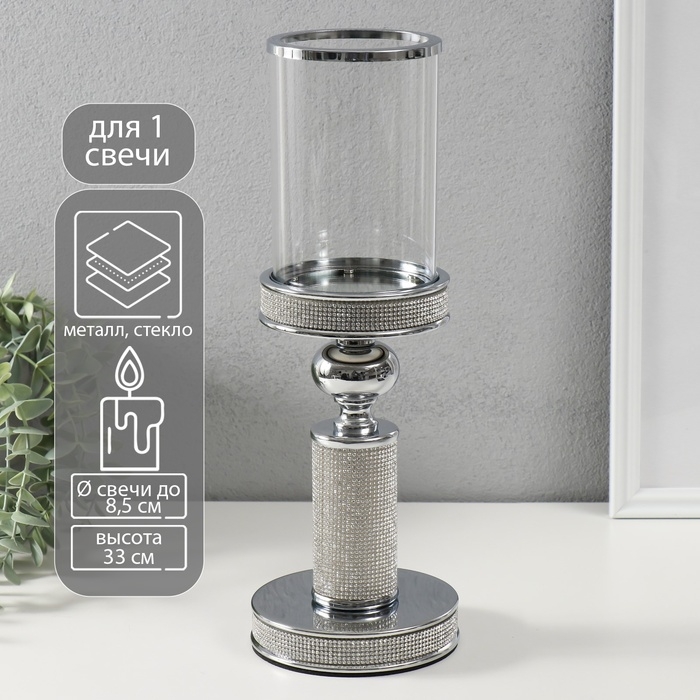 Подсвечник стекло, металл на 1 свечу "Дэниз" на магните d=8,5 см, серебро 11,8х11,8х33 см