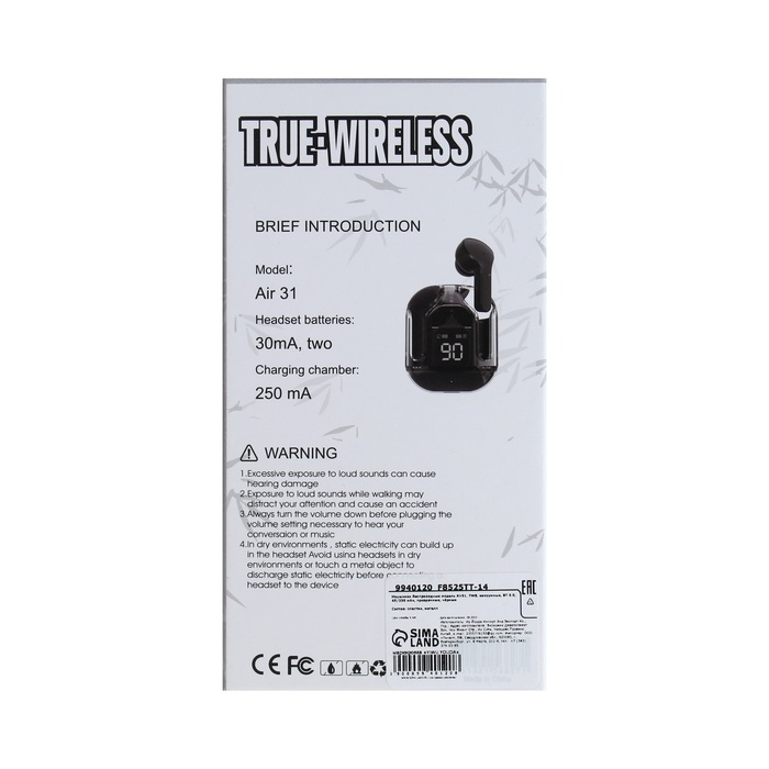 Наушники беспроводные Air31, TWS, вакуумные, BT 5.0, 45/230 мАч, прозрачные, чёрные