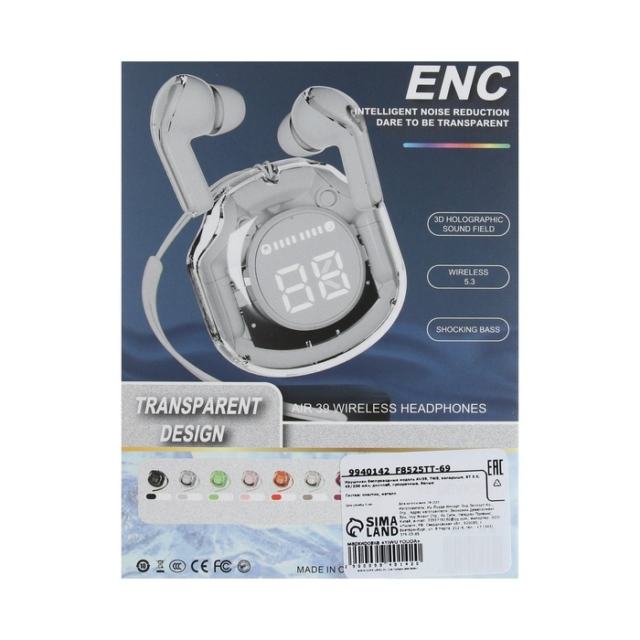 Наушники беспроводные Air39, TWS, вакуумные, BT 5.0, 45/200 мАч, дисплей, прозрачные, белые