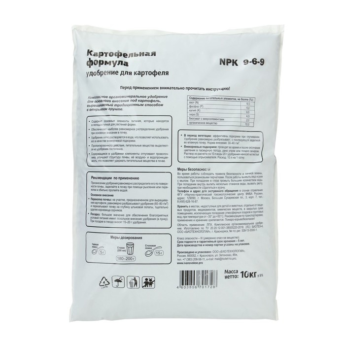 Комплексное органоминеральное удобрение для картофеля, содержащее сбалансированный набор макро- и микроэлементов. Это основная подкормка для картофеля в течение всего вегетационного сезона. Удобрение способствует созреванию полноценных, здоровых клубней с прекрасными вкусовыми качествами и отличными показателями массы и лежкости. В целом «Картофельная формула» позволяет сократить сроки созревания растений на две недели и обеспечивает увеличение урожая на 35-40%. улучшает вкусовые качества и крахмалистость картофеля;— обеспечивает эффективную защиту от проволочника;— экономно расходуется и имеет низкую цену. Основное внесение:*Внесение при перекопке почвы. Ранней весной на участке, предназначенном для выращивания картофеля, равномерно разбрасывают удобрение (60-80г/м2 и перекапывают почву на глубину штыковой лопаты, тщательно удаляя корневища сорняков.*Внесение при посадке. Большое значение для обеспечения более благоприятных условий питания имеет локальное внесение удобрения (в лунку). При посадке в гнездо вносят 15-20г удобрения.*В период вегетации. Также можно подкормить при окучивании. Подкормку проводят сухим способом, заделывая удобрение во влажную почву. Норма внесения — ЗО-40г/м2. Внекорневая подкормка:*Опрыскивание. Растворить 20г препарата в 1Ол воды. Допускается осадок, который, при необходимости, можно отфильтровать. Приготовленным раствором опрыскивать листья до их равномерного смачивания. Внекорневые подкормки проводят в пасмурную погоду, рано утром или поздно вечером, раствор наносят на листья с помощью опрыскивателя. Расход рабочего раствора: 10л на 25м2.