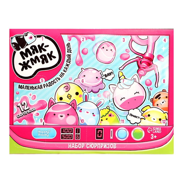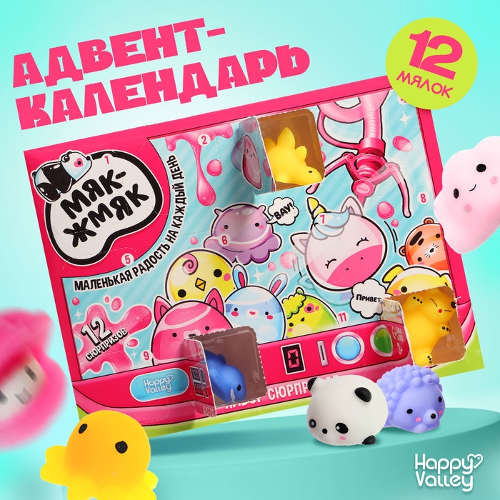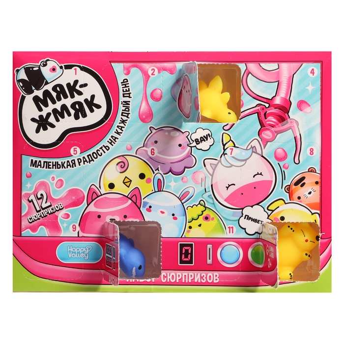 Набор сюрпризов «Мяк-жмяк» — это адвент-календарь с окошками, в которых прячутся жмяки в виде разных интересных фигурок. Открывайте по одному окошку календаря каждый день. Начните открывать его за 12 дней до Нового года или дня рождения ребёнка, так будет интереснее ждать праздник!