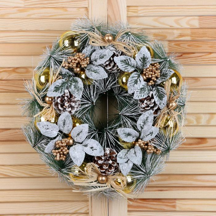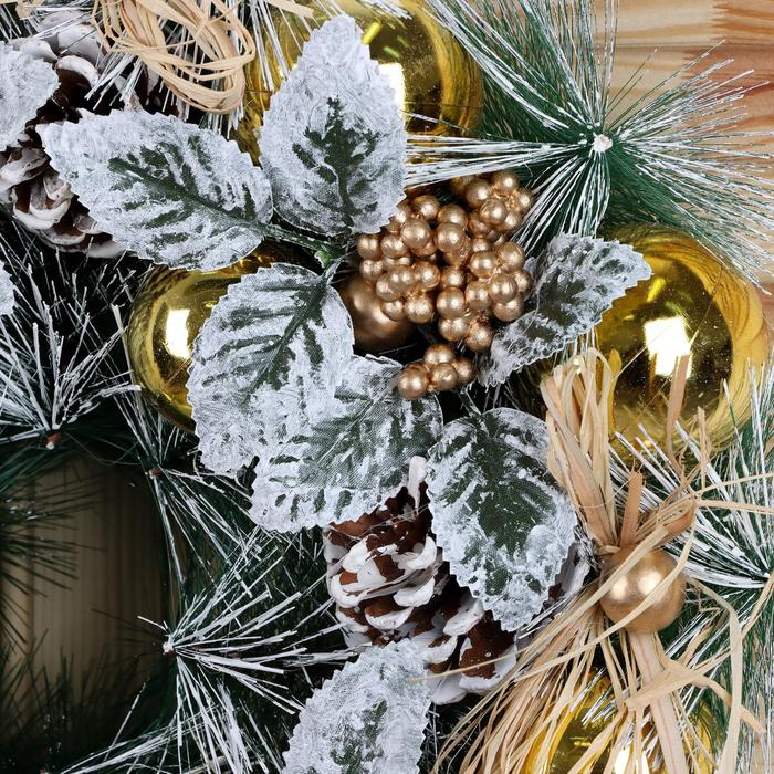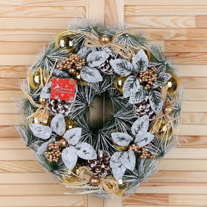 Венок новогодний d-34 см "Шишки и белёные листики"