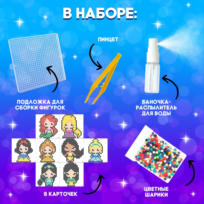 С аквамозаикой «Принцессы» ребёнок соберёт из шариков-пикселей 8 объёмных фигурок, потренирует мелкую моторику и внимание. С поделками можно играть или украсить интерьер.