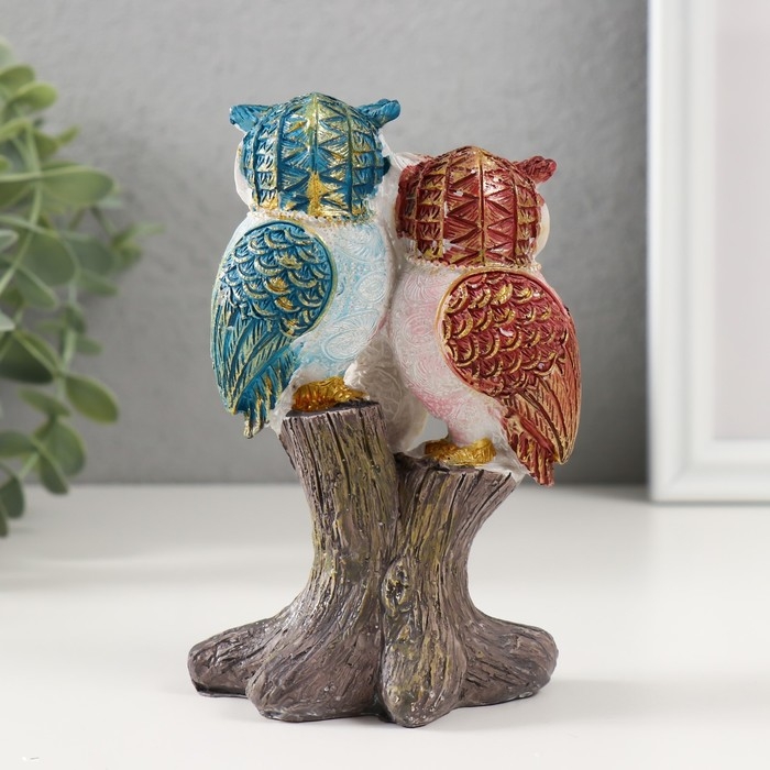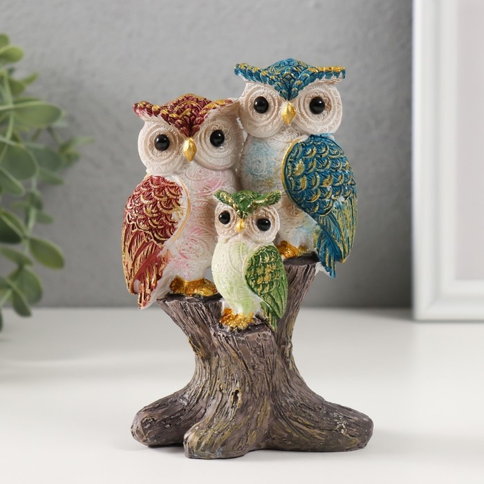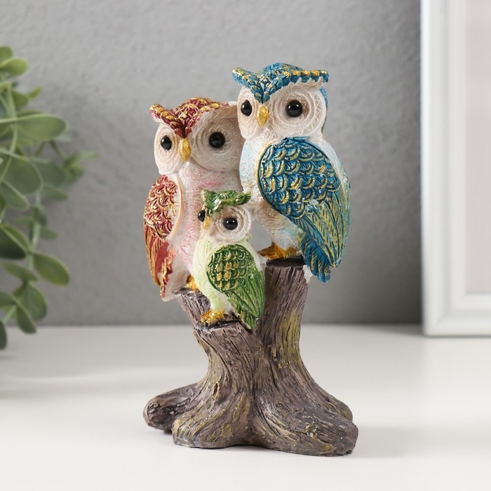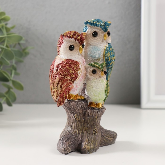 Сувенир полистоун "Семья цветных филинов на пне" 5,2х8х13 см